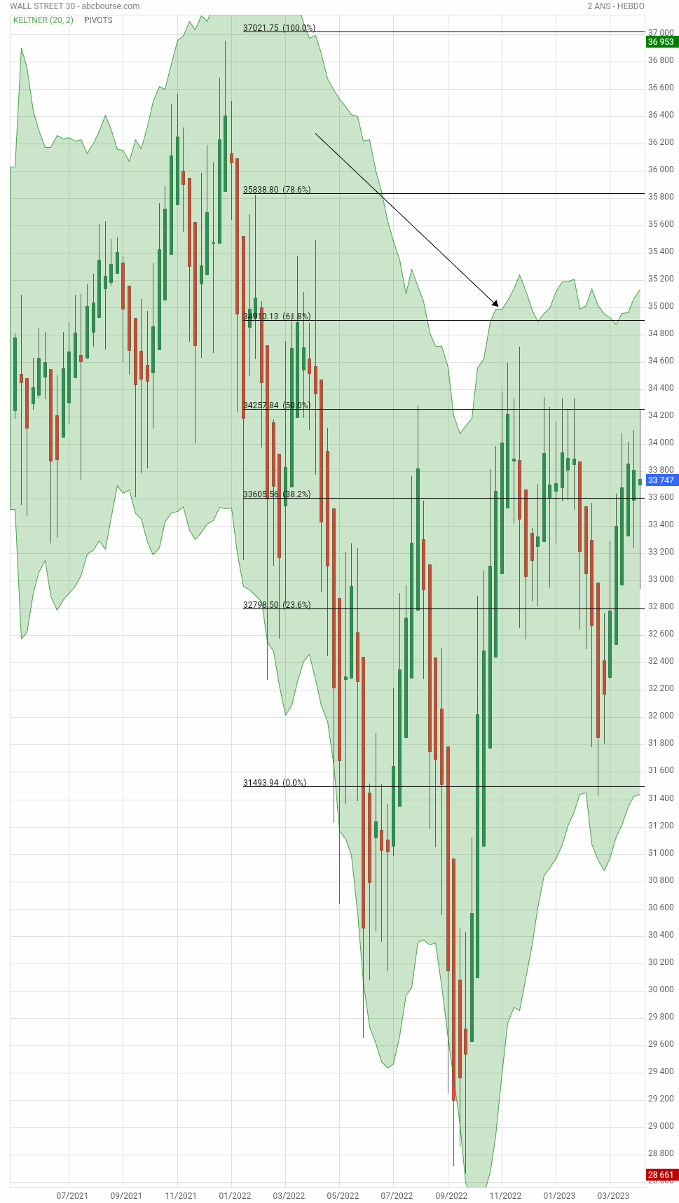 Lors de sa remontada depuis 28600, le Dow a été stoppé vers 34800. La flèche le montre ici.