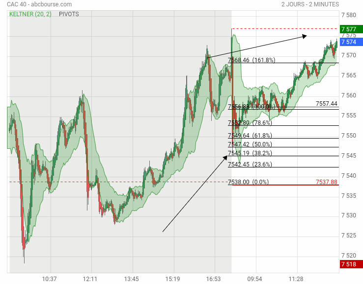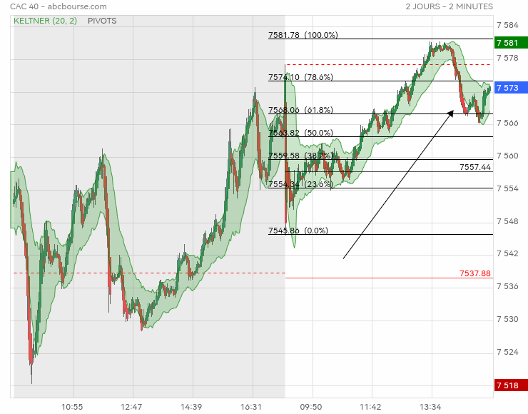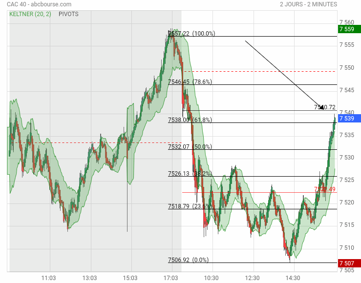 Ce jour le Cac a oscillé entre 7500 et 7540. Soit depuis le fibo 0 (7500) sur range 7500/7600.