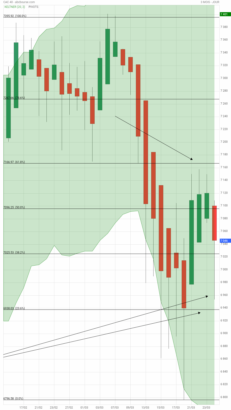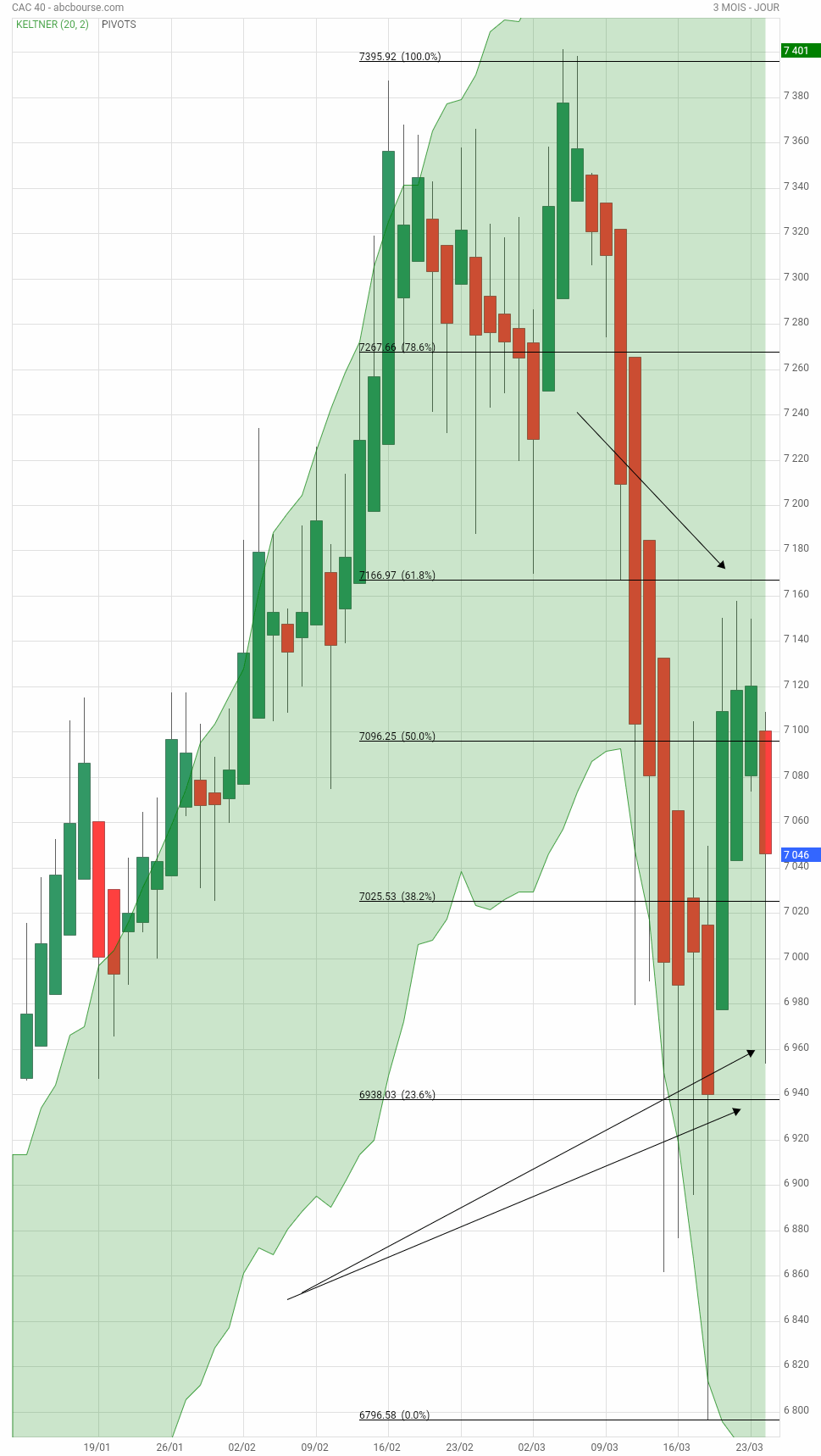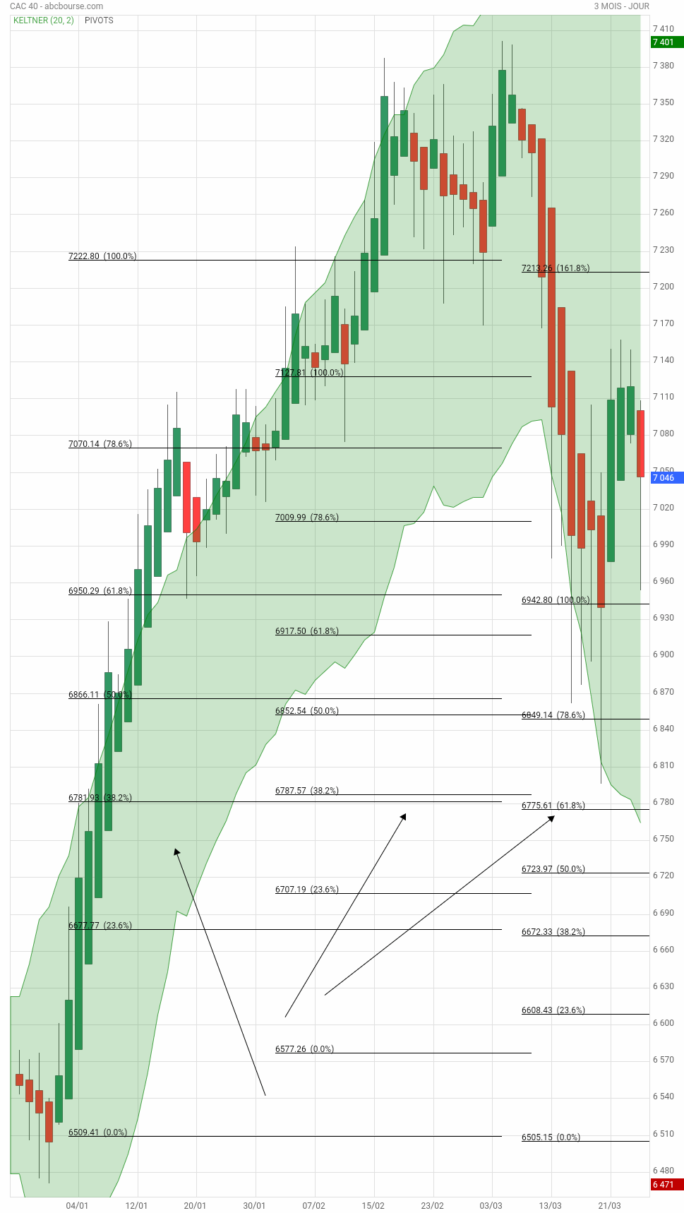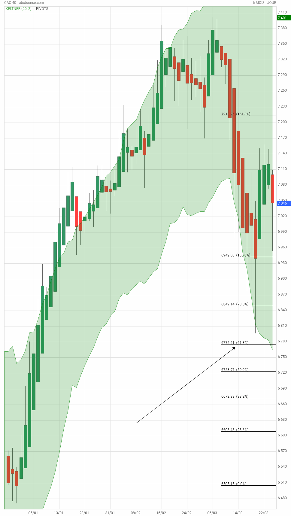 Sur cette UT 3 mois , les 2 flèches à droite en bas montrent le niveau de rebond , ce jour, 6953.