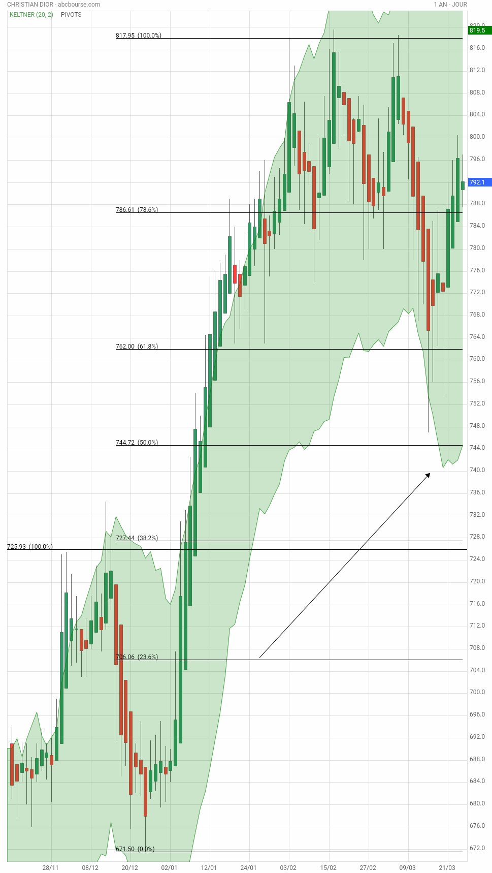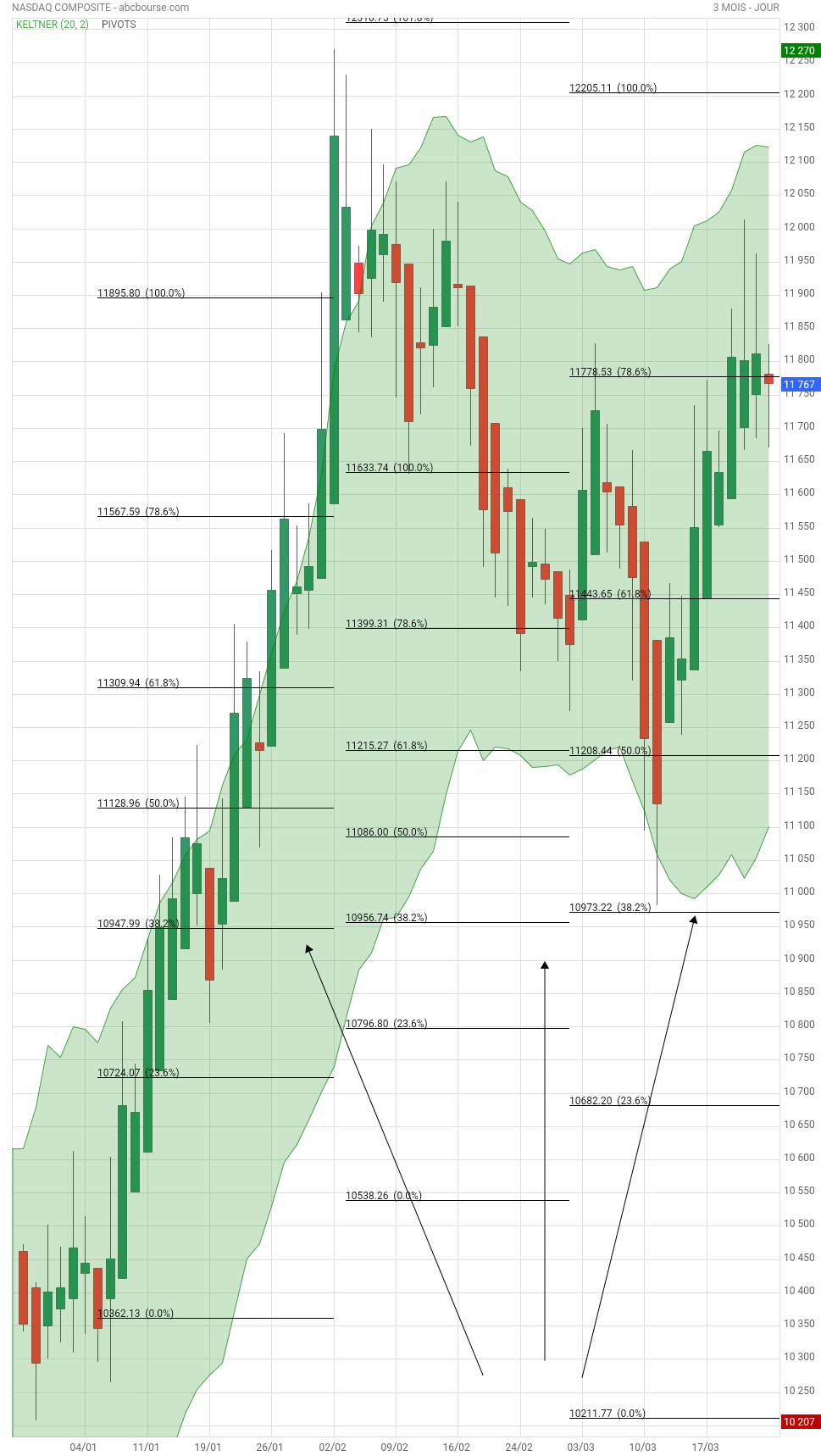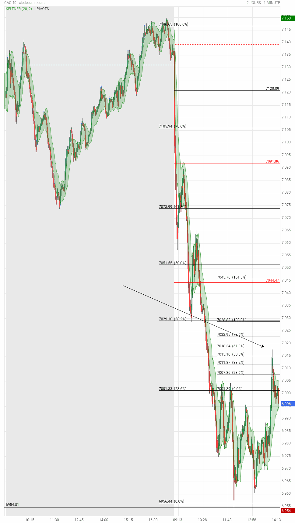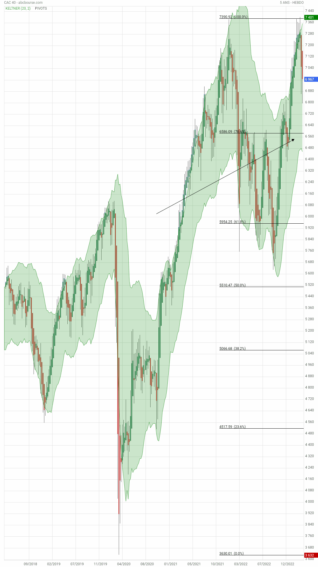 Sur cette UT 3 mois , les 2 flèches à droite en bas montrent le niveau de rebond , ce jour, 6953.