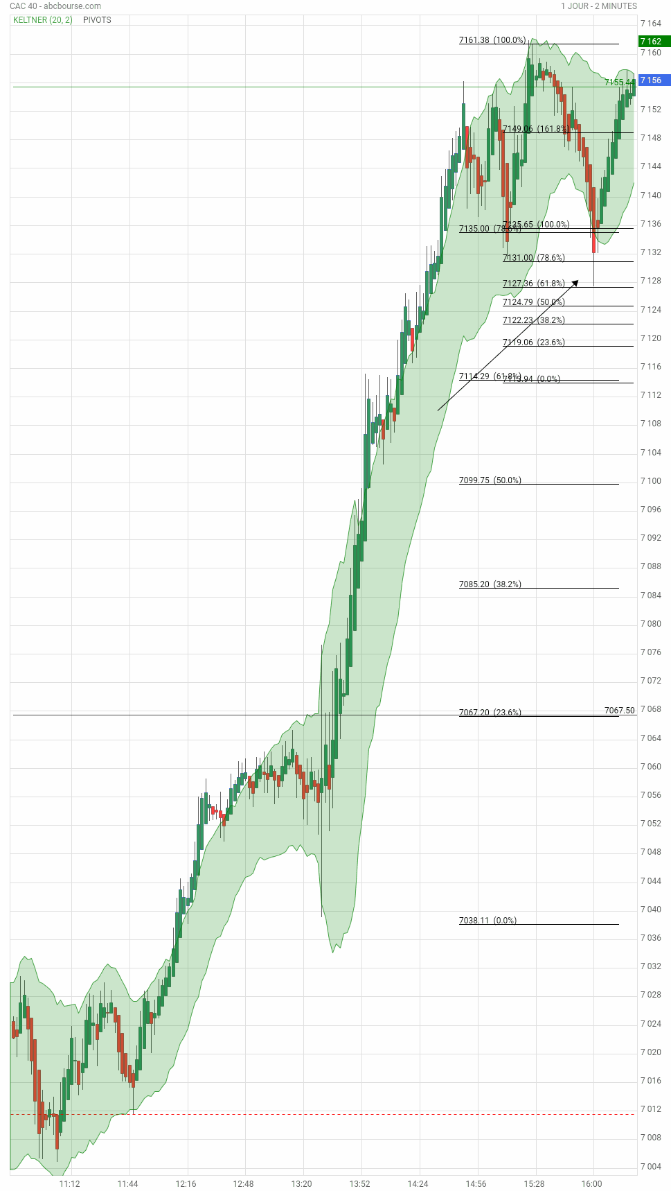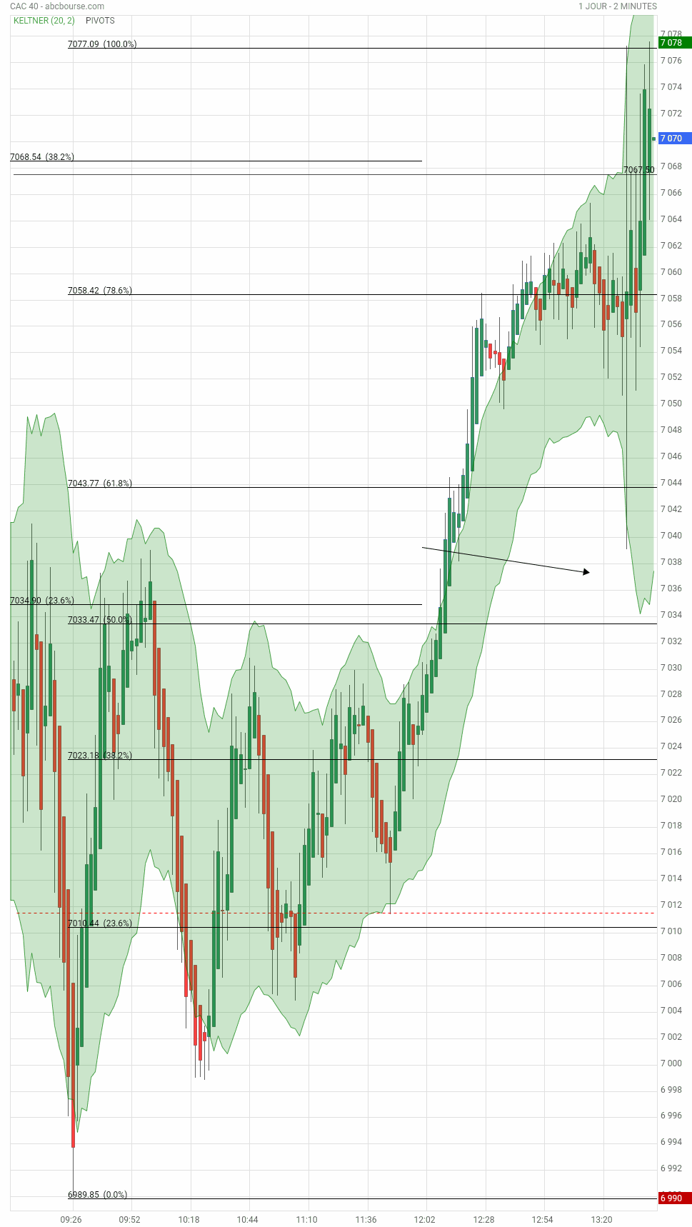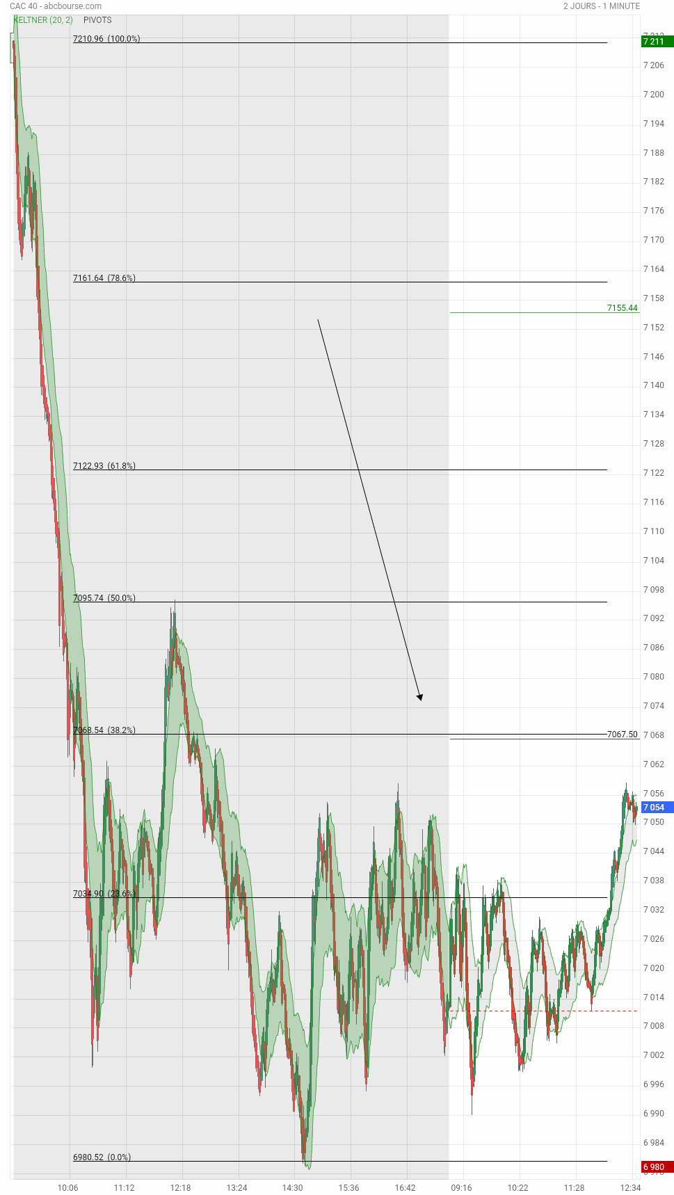 Vue 2 jours ici. On se rapproche des 38% de retracement, 7066 environ.