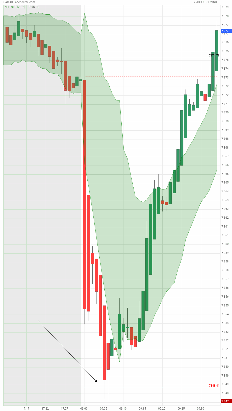 Rebond depuis S 1 , fléché. On arrive sur la clôture d'hier. Le haut nuit s'est produit vers 7390.