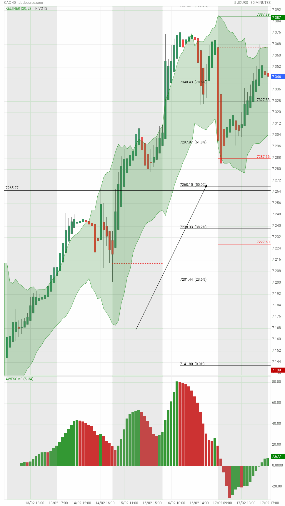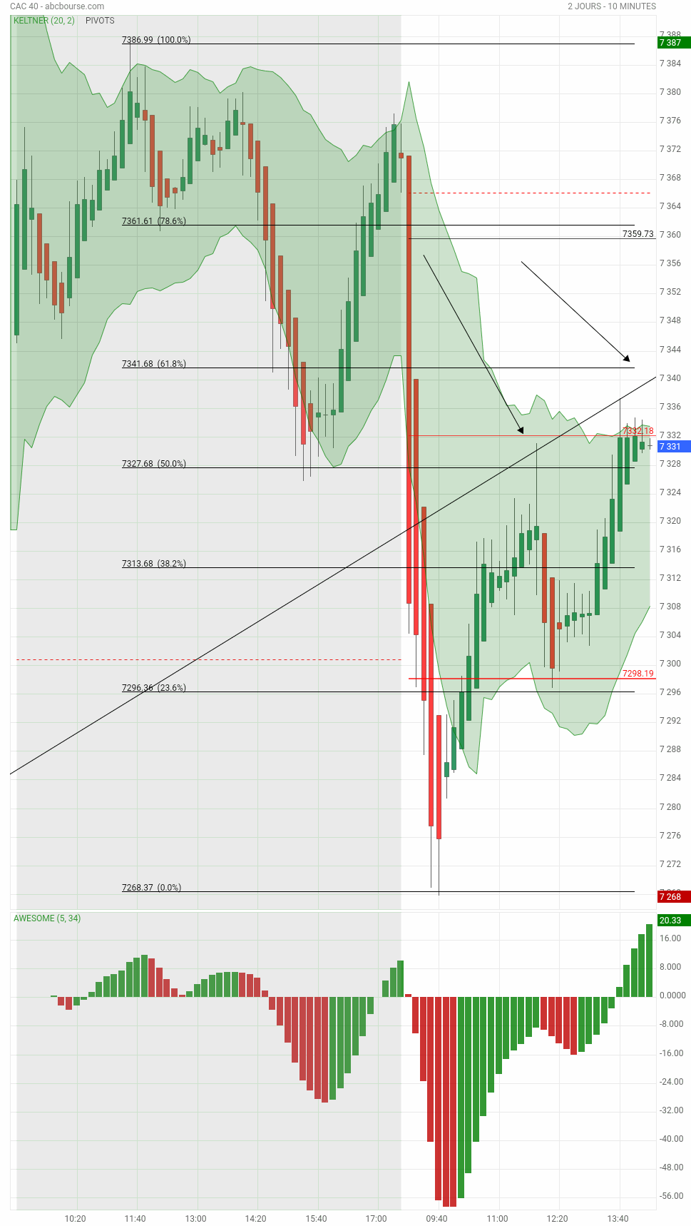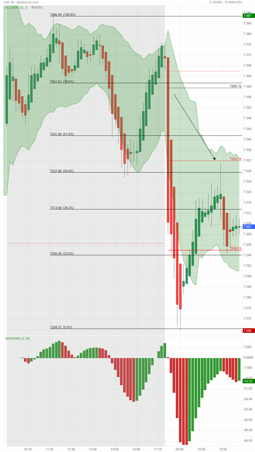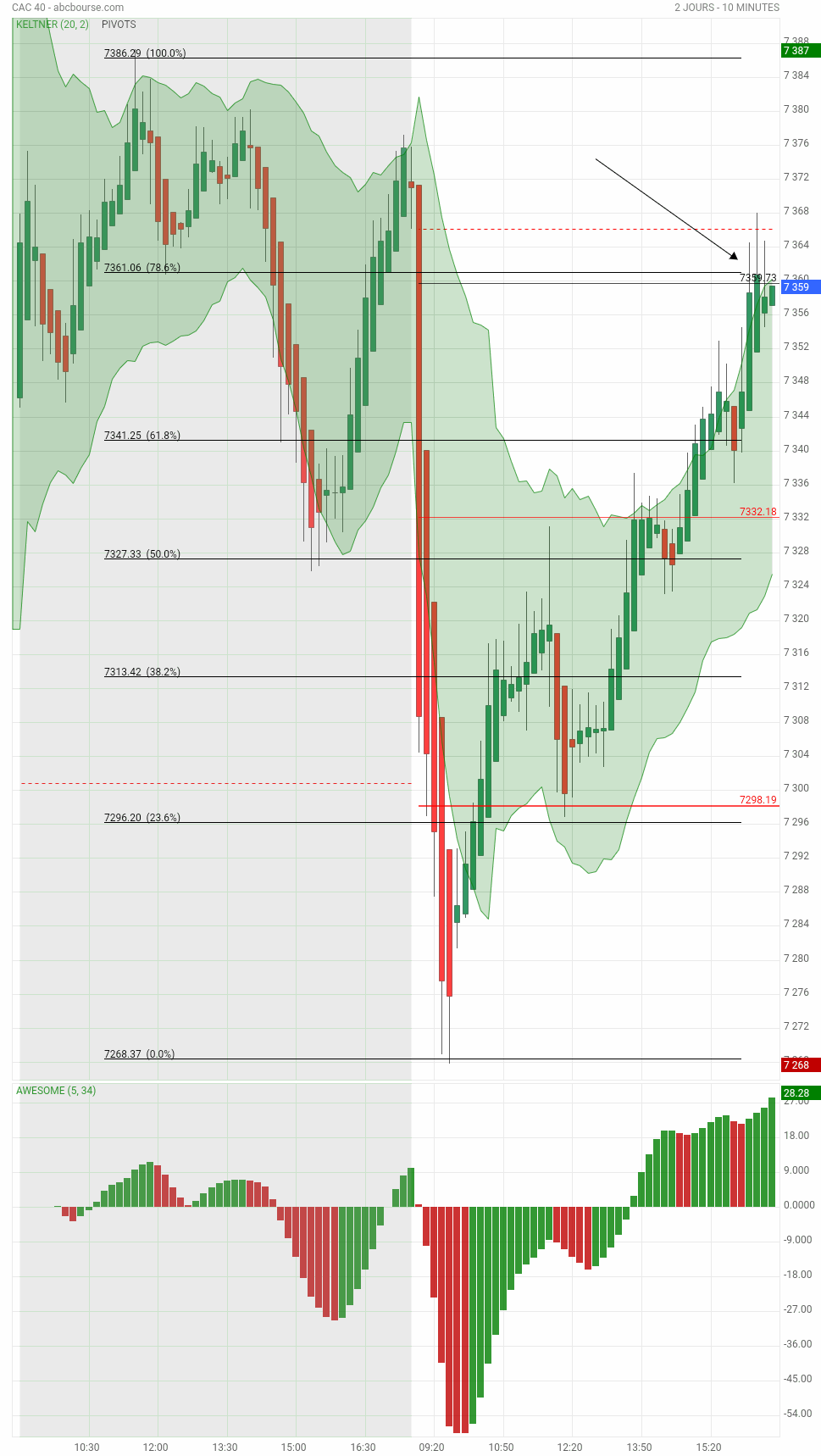 A droite fléché, le pivot PP et le dernier fibo avant 100%...et la clôture d'hier sur 7366.