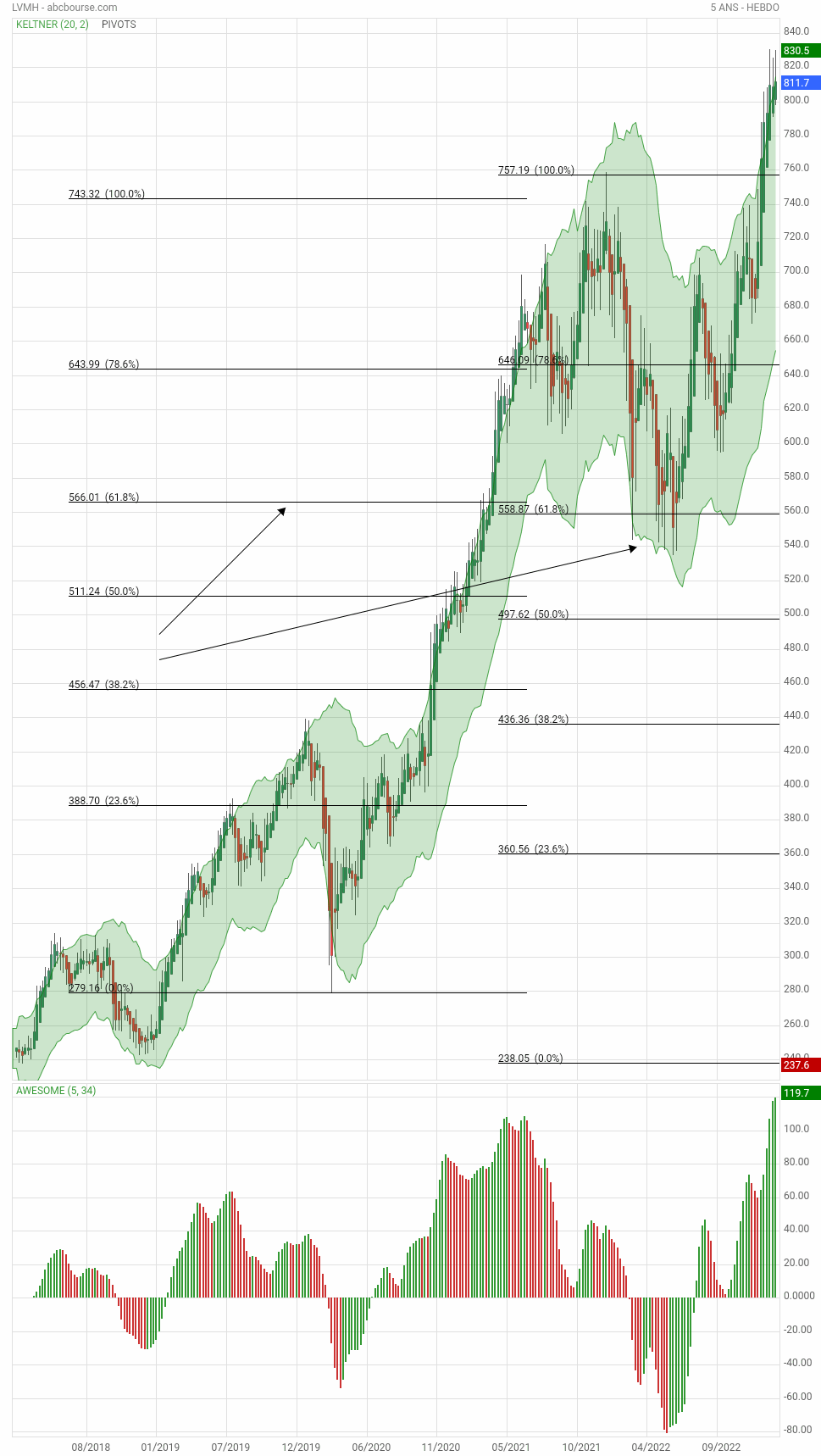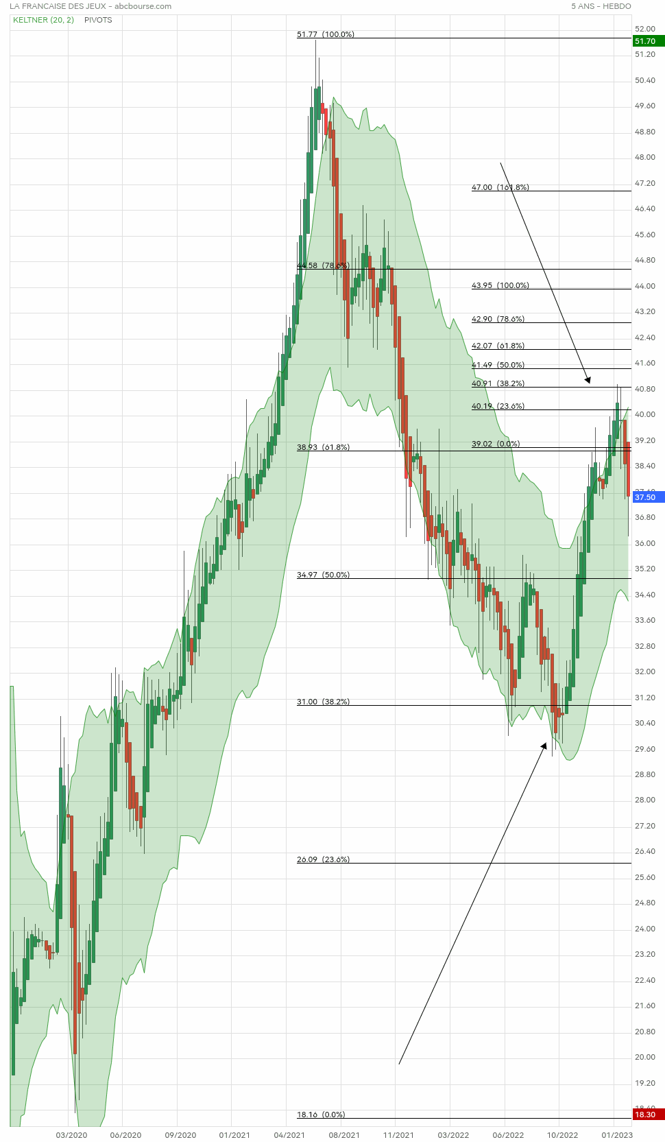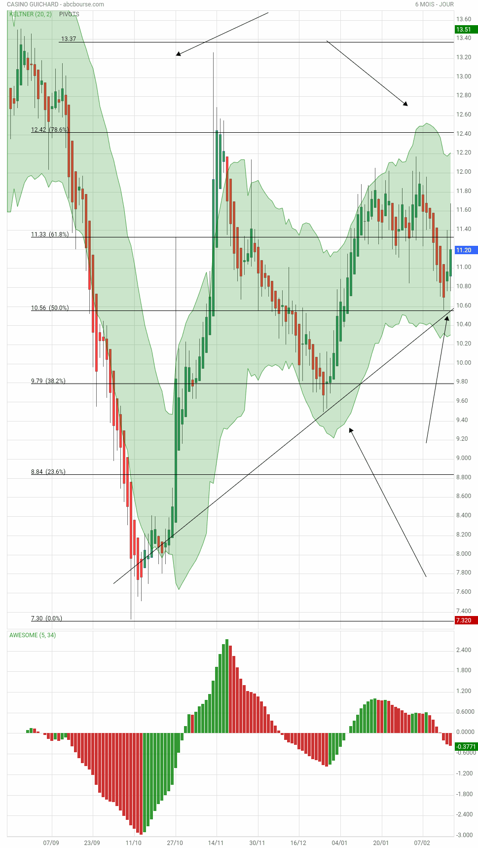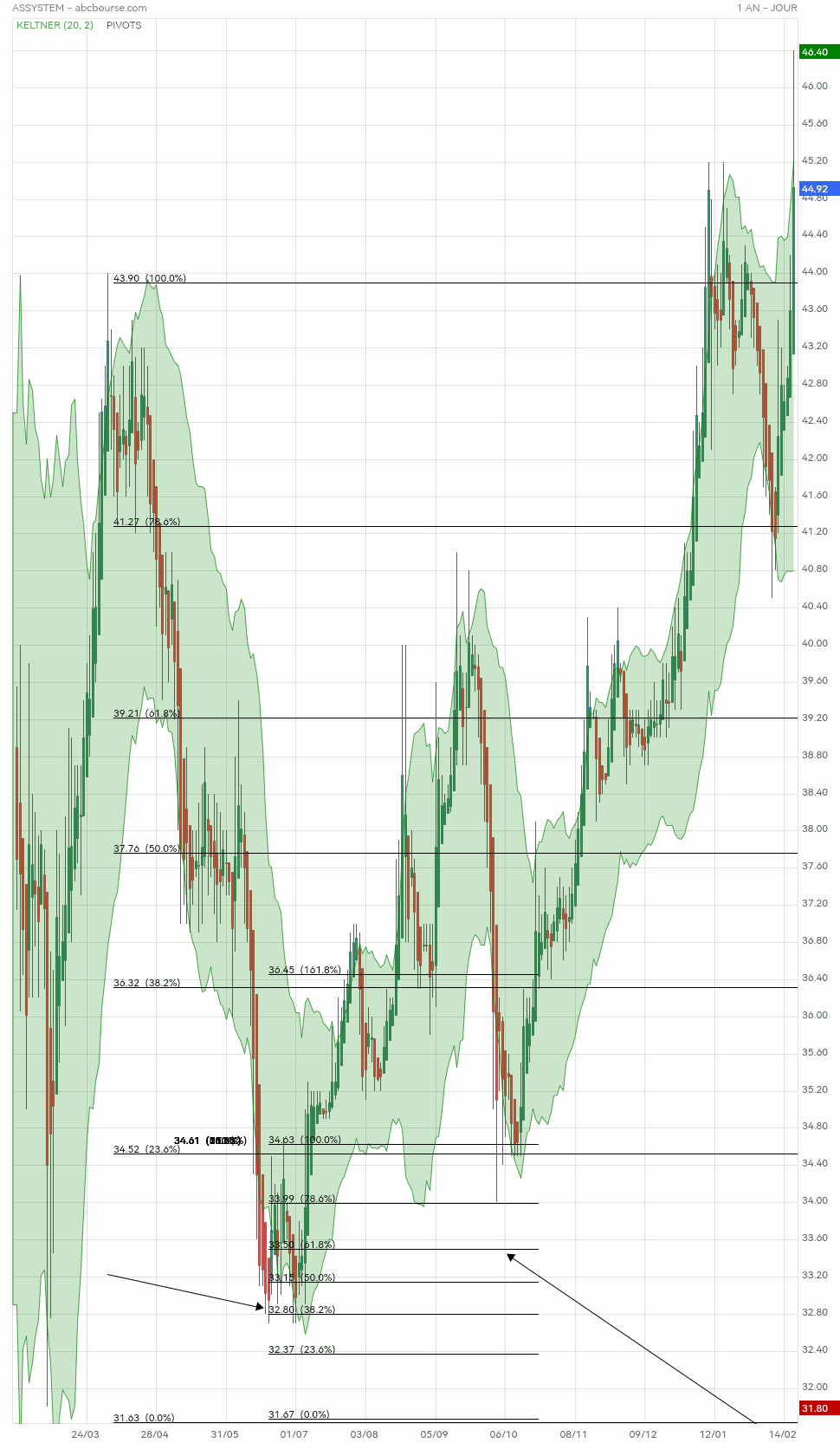 On peut voir que le cours a oscillé entre les fibos 38, support, et 62, résistance du grand range. Certes, en haut le mini fibo tracé 100% n'est pas exactement sur la ligne 76 % mais ça change peu de chose.