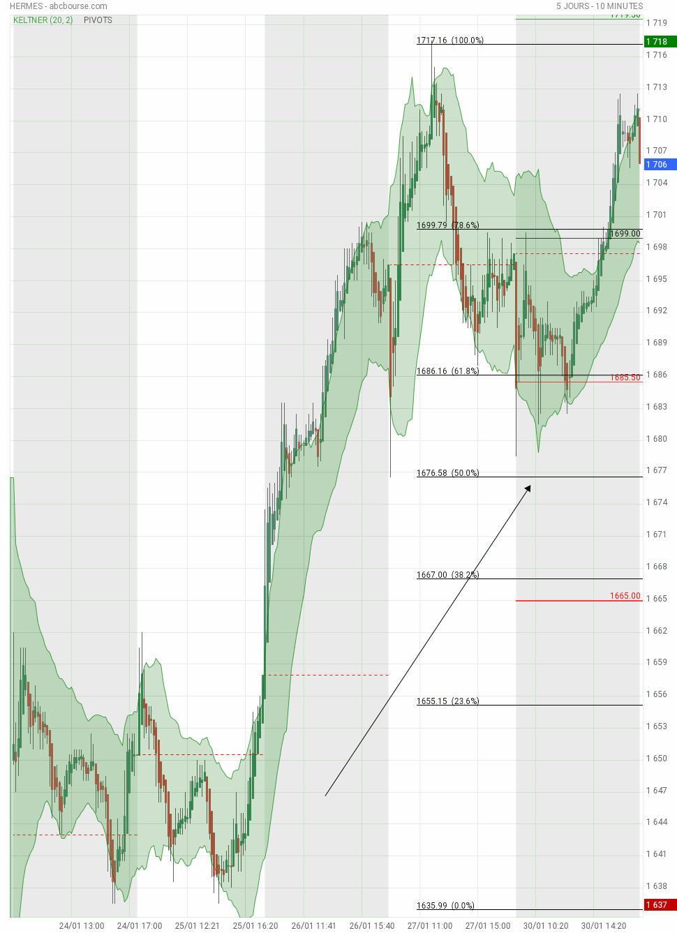 hermes s’est repliée sur son support assez habituel pour une blue chip....et en période de belle volatilité.si la valeur redescend, on aura une forme en M avec tarvets possibles jusque 1677 et 1637