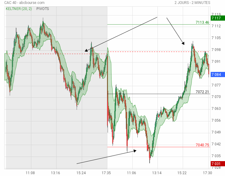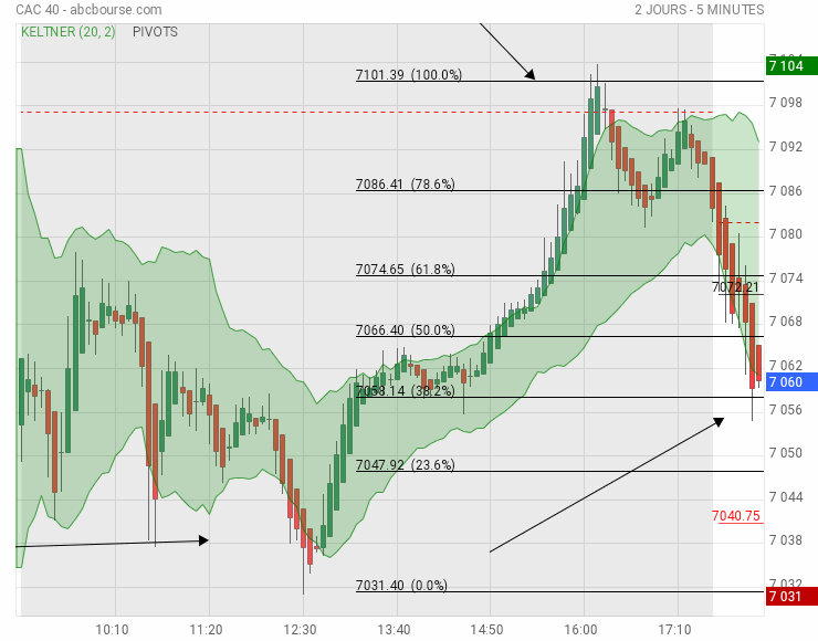 Le Cac a visité 7104, soit quasi le milieu entre R1 et R 2 et s'est ensuite replié à mesure que Wall Street avait touché un haut vers 34060 , situé aussi environ entre 2 pivots, le PP et R 1.
