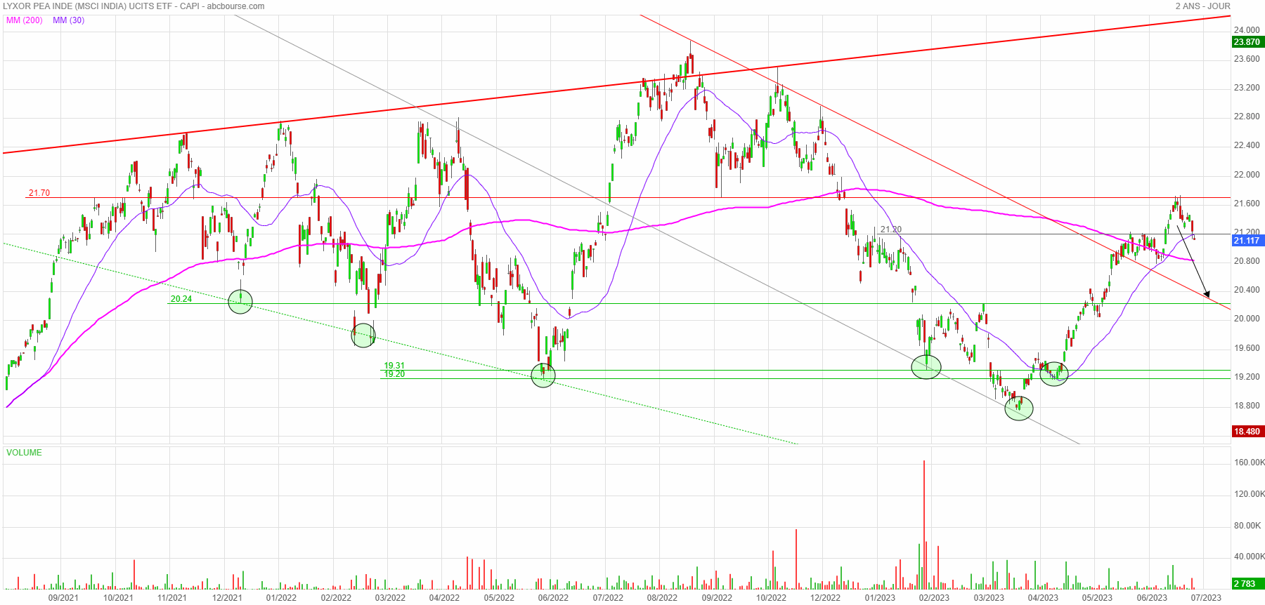 Pour revenir au sujet initial, un petit état des lieux sur le Lyxor PEA Inde : après échec sur le niveau pivot des 21.7€, retour très probable sur les 20.24€.