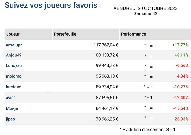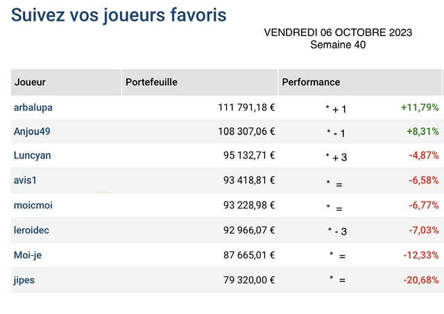 Arba , +13.72%, alors là ! Elle fait fort ! Je trouve que le sexe faible est très fort), Anjou49 +8.50%, Lulu -3.47%, Mcm – 4.46%, Leroidec – 8.49%, Avis1 – 9.87%, Moi-Je (vroum) -13.90%, Jipes – 24.17%.