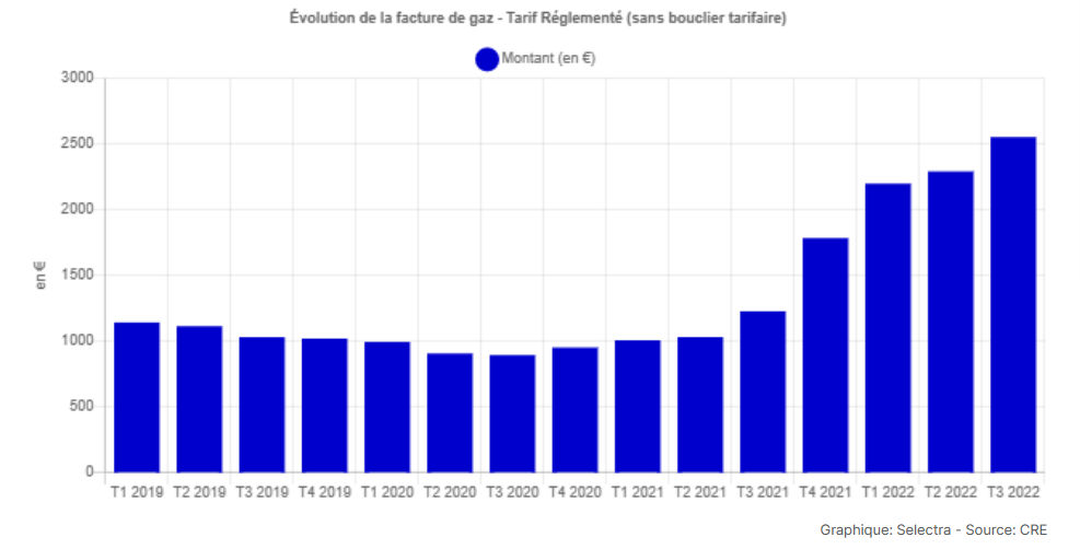 Ci-dessous l'évolution de la facture de gaz des consommateurs par trimestre et sans bouclier tarifaire (source CRE - Commission de Régulation de l'Énergie) . Sur ce graphique , la facture des consommateurs est passée de 1142€ au T1 2019 à 2553€ au T3 2022....soit + 123.55% d'augmentation.....