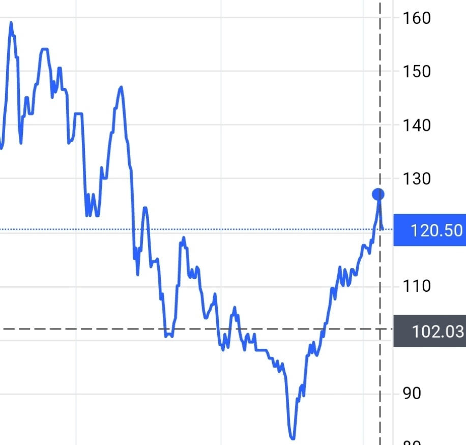 Cela représente une remontée de +50% par rapport à ses plus bas à 80 usd il y a deux mois et demie, le 3 novembre 2022.