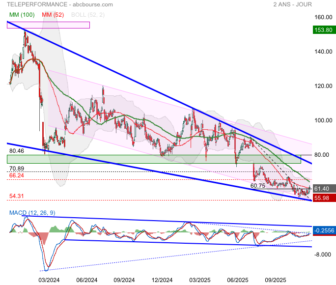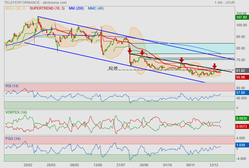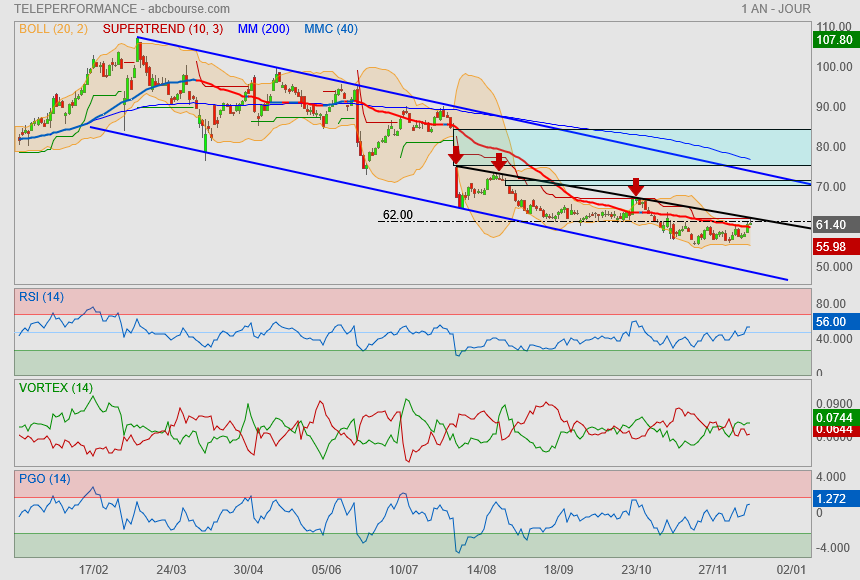 Teleperformance c’est stabilisé entre (55.98-60.75) test mm52 en fin de semaine…simple pause dans une dérive baissière très bien matérialisé par le MACD toutefois sur cette indicateur on note la formation d’un triangle et d’une divergence haussière…. Qui en cas de validation laisserait envisager un retournement plus fort…