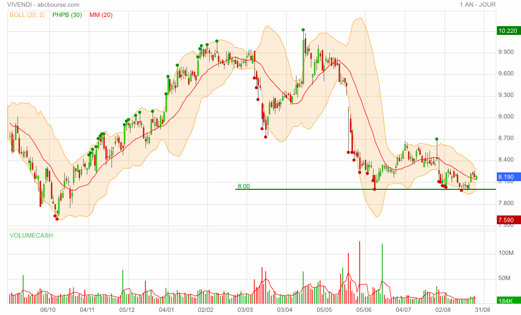 Pour Vivendi il n'y a plus d'analyse technique très valable, mais il n'y a plus aussi d'analyse fondamentale vraiment possible. Là on est entre les mains du patron qui fera ce qu'il voudra sans avoir le moindre besoin des petits porteurs, ni même des fonds (s'il y en a) qui ont pris une position assez importante. Le canal de variation entre 8 et 9 euros sera sans doute long à subsister.