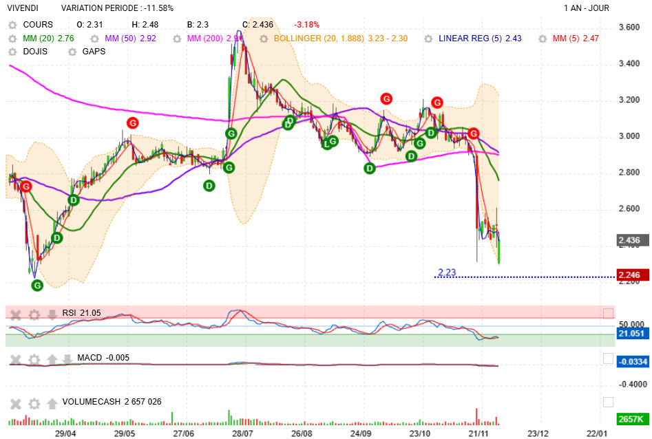 Vivendi : 2,365 € (-3,31%)