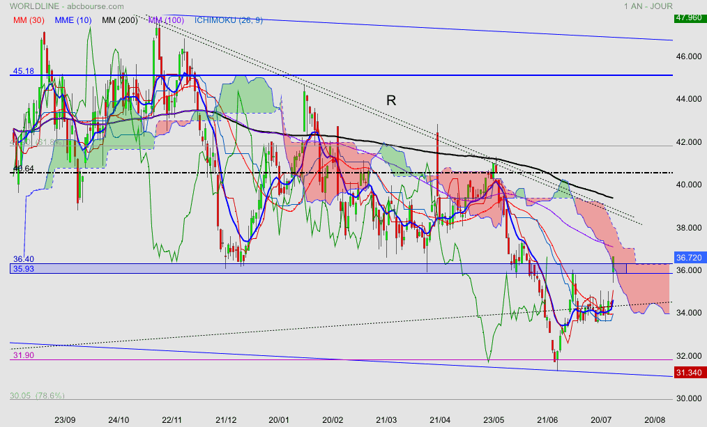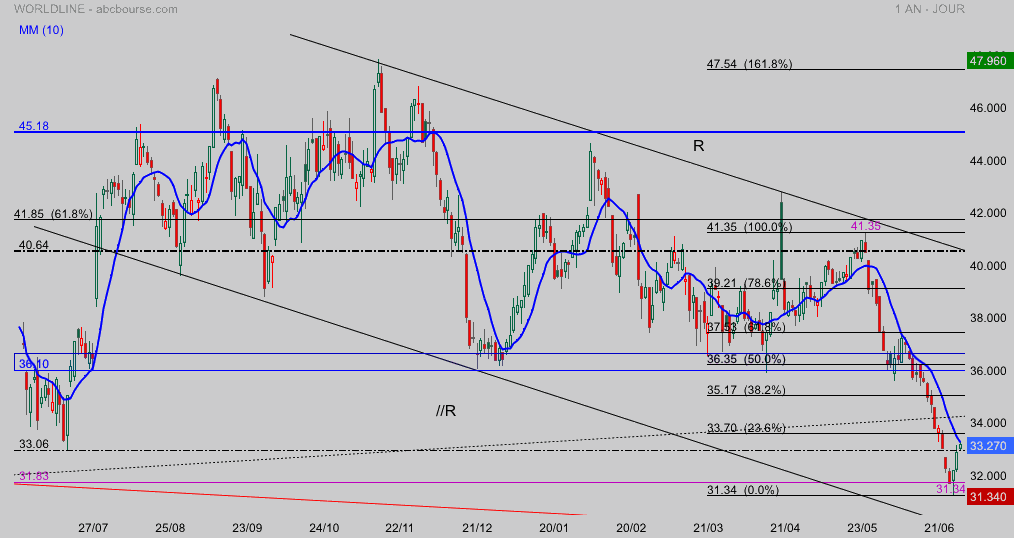 Worldline en mise en surveillance, rien ni fait la valeur reste là mal aimé malgré de bon résultats le cours revient sur le support 31.90 on peut même envisager un triangle rectangle avec un gros potentiel baissier..