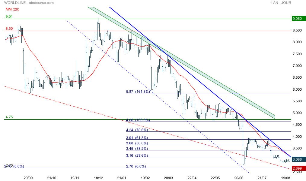 Wordline est en hausse ce jour nouvelle tentative de sortie du tunnel baissier où coïncide la mm26 et fibonnacci 23% (3.16-3.24) , le franchissement de ces résistances mettrai fin à la pression baissière débuté 4.66€