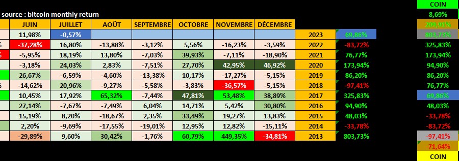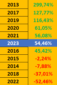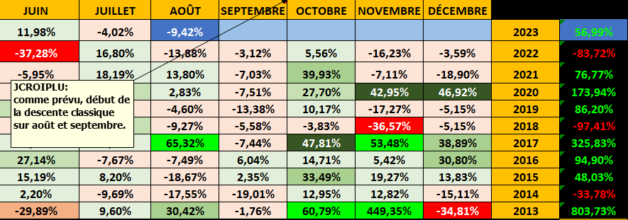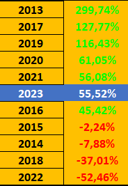 Ce qui fait que pour 2023 le bitcoin en est à +54.46%, année pour le moment qui se situe dans les années positives en "pile", entre les années 2120 et 2016.