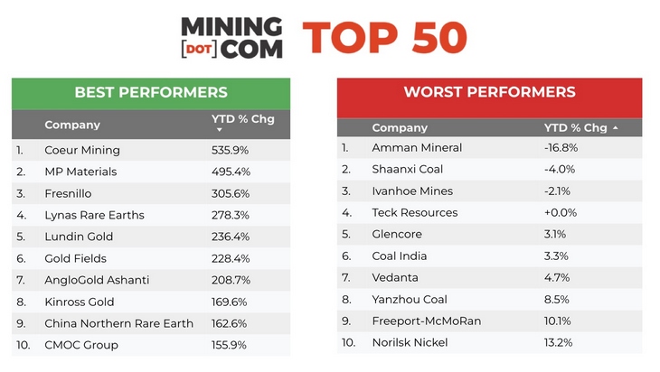Depuis sa création, le TOP 50 de MINING.COM était dominé par deux entreprises – BHP et Rio Tinto – les seules sociétés minières affichant une capitalisation boursière supérieure à 100 milliards de dollars (avec quelques fluctuations ) . Cinq entreprises se distinguent désormais, et d'autres suivront probablement.