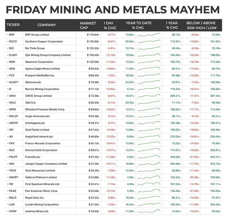 GRAPHIQUE : Massacre des valeurs minières vendredi, mais le prix du cuivre se redresse après sa chute vertigineuse.