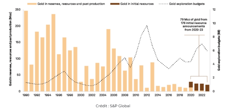 Toutefois, le rapport de S&P note que même si le nombre de découvertes et la quantité d'or continuent de croître chaque année, la plupart des actifs ont été découverts il y a des décennies et n'ont répondu que récemment à ses critères de découverte d'or notable.