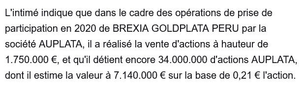 Auplata Mining Group - AMG (Euronext Growth - FR0013410370 - ALAMG). Suite à la parution (non sollicitée par AMG) le 25 juin 2021, d'un article dans L'AGEFI intitulé “Le fondateur d’Auplata Mining Group assigne en référé le groupe”, faisant état de l’assignation en référé portée par Monsieur Michel Juilland, vous trouverez ci-dessous l'ordonnance rendue le 28 juin 2021 par la Présidente du Tribunal Mixte de Commerce de Cayenne dans cette affaire. Le Tribunal Mixte de Commerce de Cayenne a fait droit à l'intégralité des demandes d’AMG. Monsieur Michel Juilland a été débouté de toute ses demandes, notamment sa demande d'ajournement de l’Assemblée Générale Extraordinaire. Son action a été jugée comme "ayant causé un préjudice à la société Auplata, en portant atteinte à son image", raison pour laquelle il a été condamné à payer à AMG la somme de 1 € de dommages et intérêts. Monsieur Michel Juilland a également été condamné à payer à AMG la somme de 5000 € au titre de l'article 700 du code de procédure civile et aux entiers dépens.
