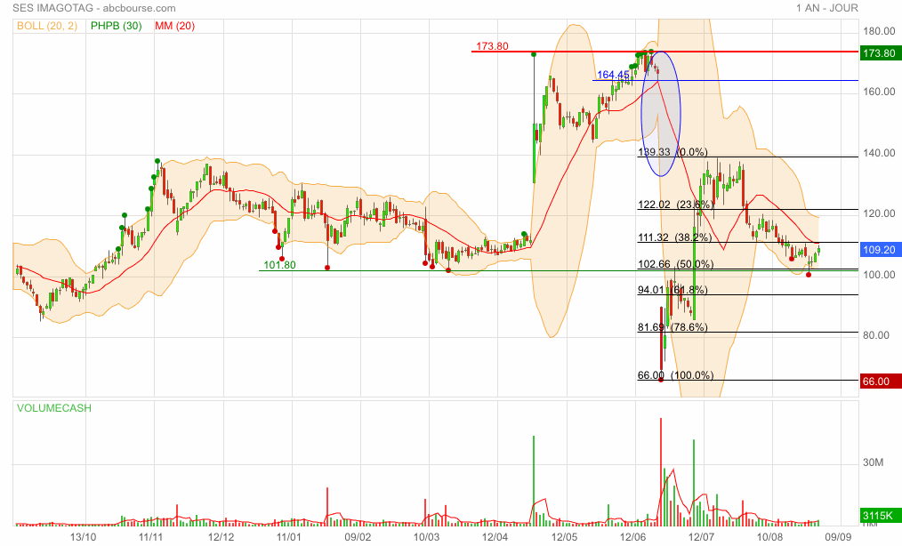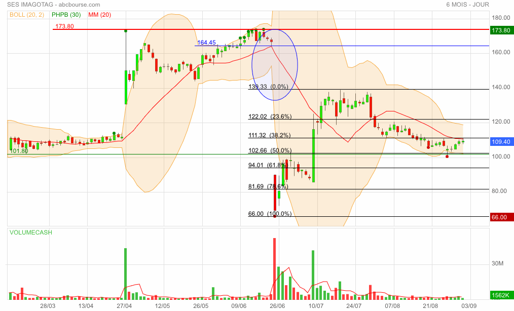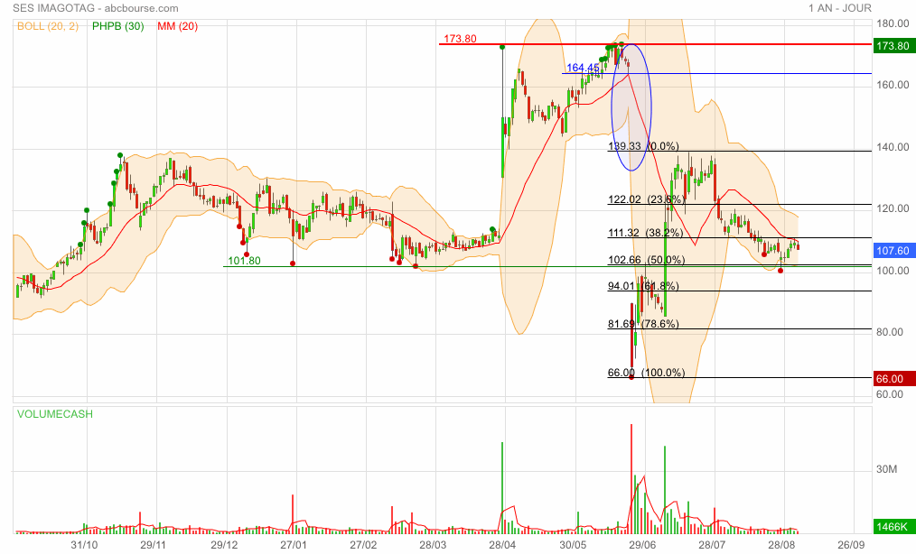 Peut-être un coup à jouer au vu de la MM20 qui semble commencer à se retourner et du franchissement des 38% Fibo pour viser 140€ top récent. Au-delà, si Gotham se calme, fermer le gap monstrueux ouvert le 23 juin et incomplètement refermé est un objectif ambitieux.