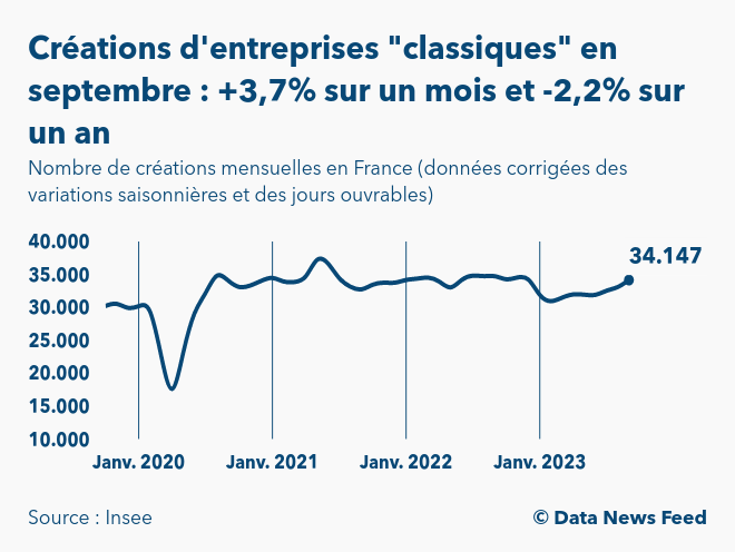 Le nombre de créations d’entreprises classiques, c’est-à-dire hors micro-entreprises, en France est ressorti à 34.147 en septembre 2023, soit une hausse de 3,7%, selon les données publiées à 8h45 par l’Institut national de la statistique et des études économiques (Insee). Par rapport à septembre 2022, les immatriculations d’entreprises classiques sont en baisse de 759 unités, soit 2,2% de moins.