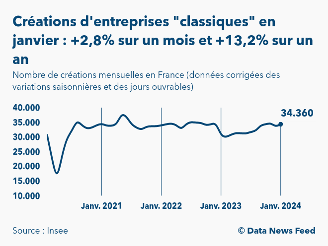 Le nombre de créations d’entreprises classiques, c’est-à-dire hors micro-entreprises, en France est ressorti à 34.360 en janvier 2024, soit une hausse de 2,8%, selon les données publiées à 8h45 par l’Institut national de la statistique et des études économiques (Insee). Par rapport à janvier 2023, les immatriculations d’entreprises classiques sont en hausse de 3.995 unités, soit 13,2% de plus.