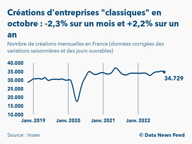 Le nombre de créations d’entreprises classiques, c’est-à-dire hors micro-entreprises, en France est ressorti à 34.729 en octobre 2022, contre 35.548 le mois précédent, soit une baisse de 2,3%, selon les données publiées à 8h45 par l’Institut national de la statistique et des études économiques (Insee).
