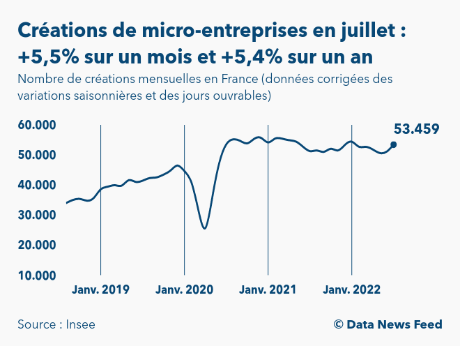 Selon les données publiées à 8h45 par l’Institut national de la statistique et des études économiques (Insee), le nombre de créations de micro-entreprises en France est ressorti en juillet 2022 à 53.459, contre 50.681 en juin, soit une hausse de 5,5% sur un mois.