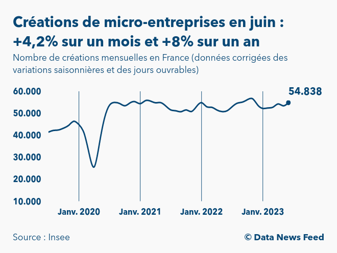 Selon les données publiées à 8h45 par l’Institut national de la statistique et des études économiques (Insee), le nombre de créations de micro-entreprises en France est ressorti en juin 2023 à 54.838, contre 52.606 en mai, soit une hausse de 4,2% sur un mois.