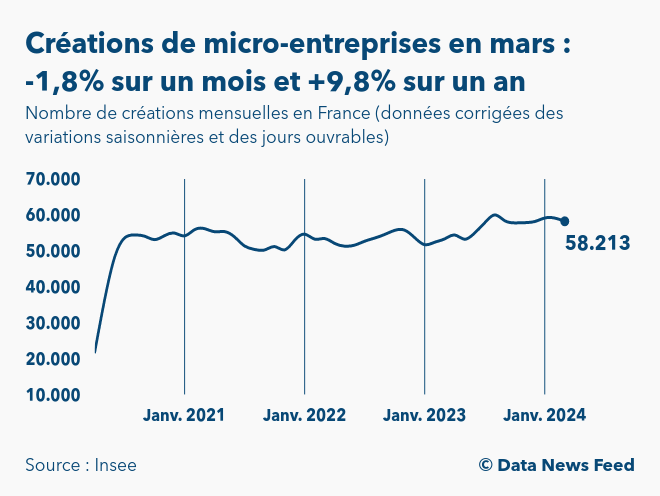Selon les données publiées à 8h45 par l’Institut national de la statistique et des études économiques (Insee), le nombre de créations de micro-entreprises en France en mars 2024 est ressorti à 58.213, contre 59.269 en février, soit une baisse de 1,8% sur un mois.