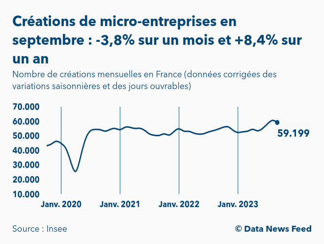 Selon les données publiées à 8h45 par l’Institut national de la statistique et des études économiques (Insee), le nombre de créations de micro-entreprises en France est ressorti en septembre 2023 à 59.199, contre 61.558 en août, soit une baisse de 3,8% sur un mois.