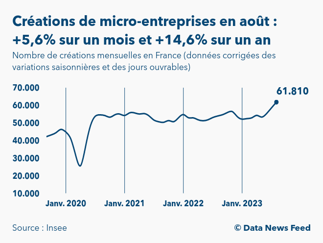 Selon les données publiées à 8h45 par l’Institut national de la statistique et des études économiques (Insee), le nombre de créations de micro-entreprises en France est ressorti en août 2023 à 61.810, contre 58.541 en juillet, soit une hausse de 5,6% sur un mois.