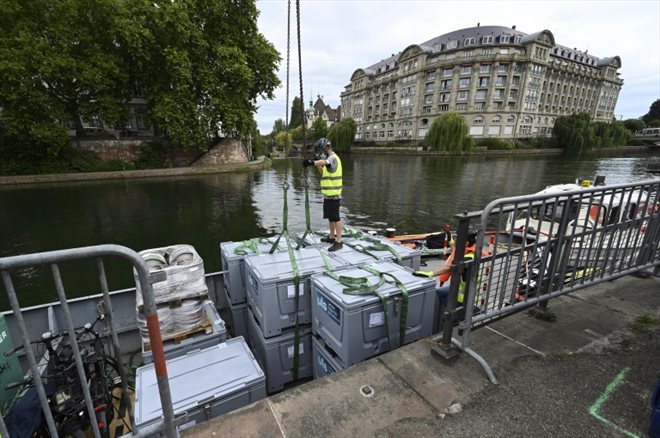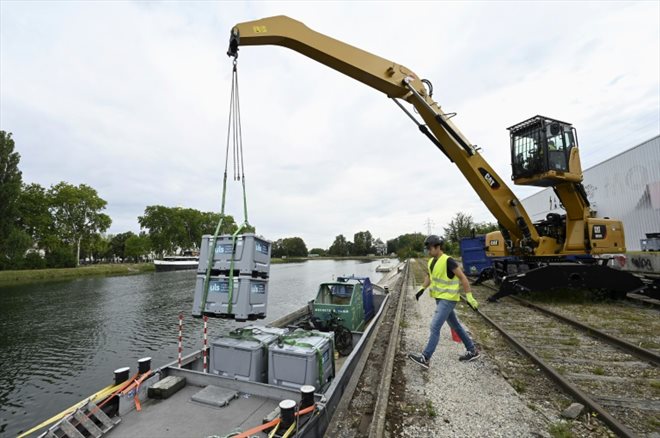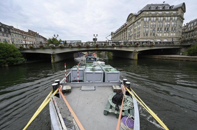 Quelques salariés s'affairent à répartir les colis dans des caissons fermés et les boissons sur des palettes. Puis une grue les dépose à bord d'une barge qui rejoint en 27 minutes chrono le quai des Pêcheurs, sur l'Ill, la rivière qui borde le centre historique de Strasbourg, passant devant le Parlement européen. Un parcours sans bouchons, silencieux et très peu polluant : la barge est propulsée au gaz naturel.