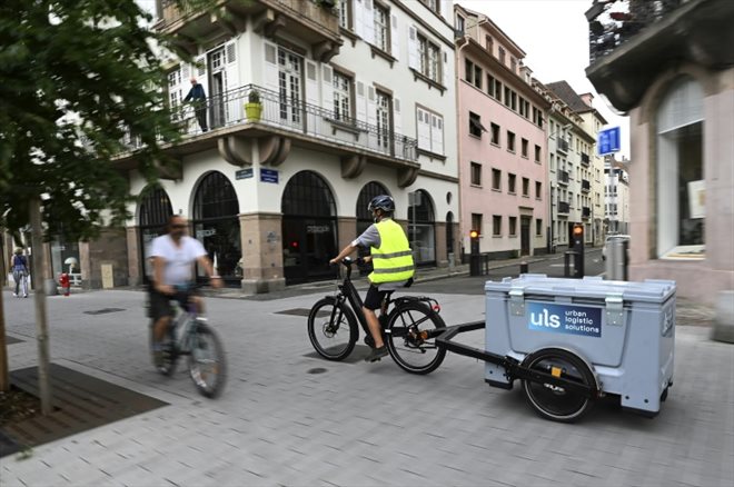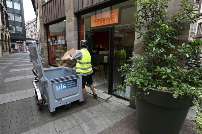 Vêtements, lunettes, cartouches d'imprimante, fûts de bière, caisses de boissons... Depuis quelques semaines, ces marchandises de tous les jours sont livrées aux commerces du centre-ville de Strasbourg par voie fluviale puis vélos électriques.