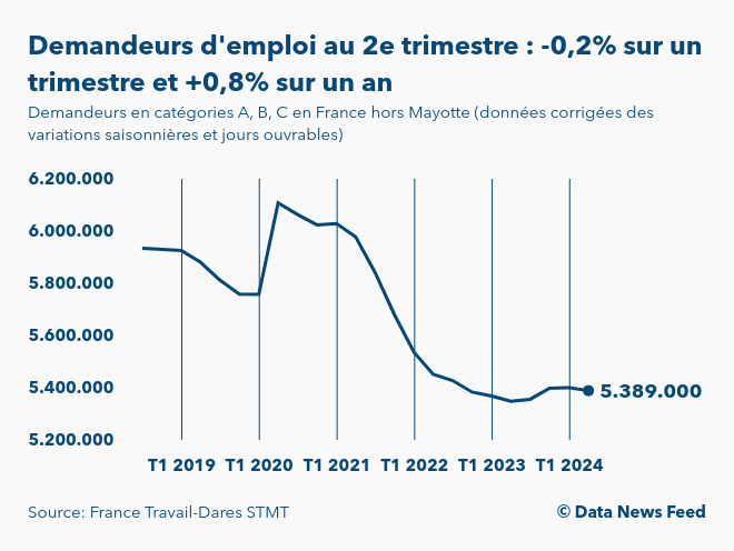 Selon les données publiées par France Travail (ex-Pôle emploi) et la Dares, le nombre de demandeurs d'emploi (catégorie A, B et C) en France (hors Mayotte) ressort à 5.389.000 au 2e trimestre 2024. Il recule ainsi de 0,2% (-11.500 inscrits) par rapport au trimestre précédent (5.400.500 inscrits). Les catégories A, B et C correspondent aux personnes inscrites et tenues de rechercher un emploi. Sur un an, le nombre de chômeurs enregistrés à France Travail augmente de 0,8% (+41.100 inscrits).