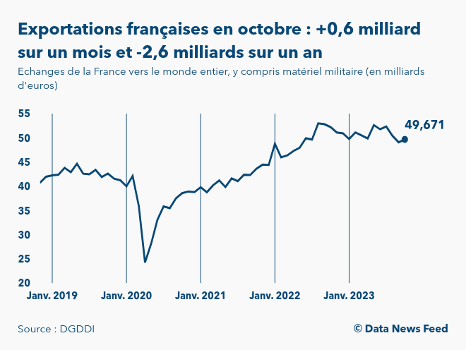 Les exportations de la France ont atteint 49,7 milliards d’euros en octobre 2023, selon les chiffres de la Direction générale des douanes. Elles ont progressé de +1,2% (soit +0,6 milliard d’euros) par rapport à septembre 2023. Sur un an, les exportations de biens de la France vers le monde entier sont en baisse de -4,9% (soit -2,6 milliards d’euros).