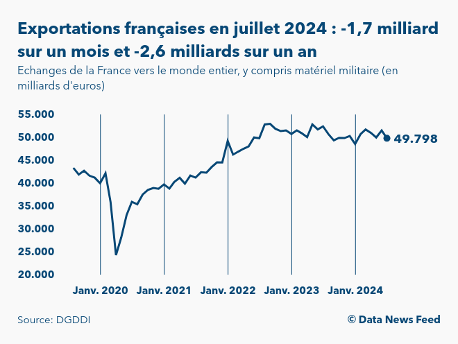 Les exportations de la France ont atteint 49,8 milliards d’euros en juillet 2024, selon les chiffres de la Direction générale des douanes. Elles ont reculé de 3,3% (soit -1,7 milliard d’euros) par rapport à juin 2024. Sur un an, les exportations de biens de la France vers le monde entier sont en baisse de 5% (soit -2,6 milliards d’euros).