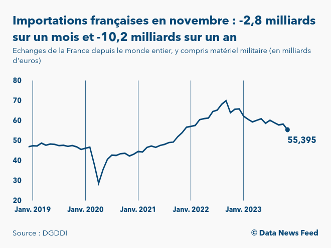 En France, les importations ont atteint 55,4 milliards d’euros en novembre 2023, selon les chiffres de la Direction générale des douanes. Elles ont diminué de -4,8% (soit -2,8 milliards d’euros) par rapport à octobre 2023. Sur un an, les importations de biens de la France depuis le reste du monde sont en recul de -15,6% (soit -10,2 milliards d’euros).