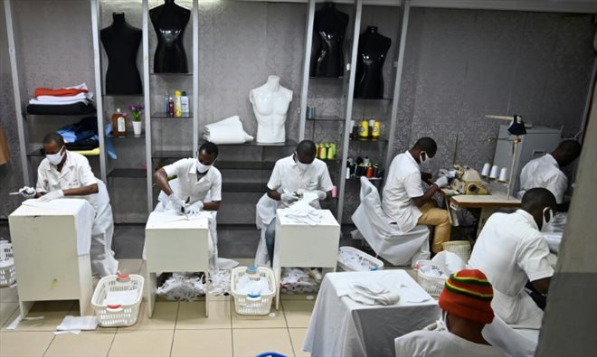 Des employés d'une société de mode fabriquent des masques de protection contre le nouveau coronavirus à Abidjan, le 9 avril 2020 en Côte d'Ivoire (AFP/ISSOUF SANOGO)