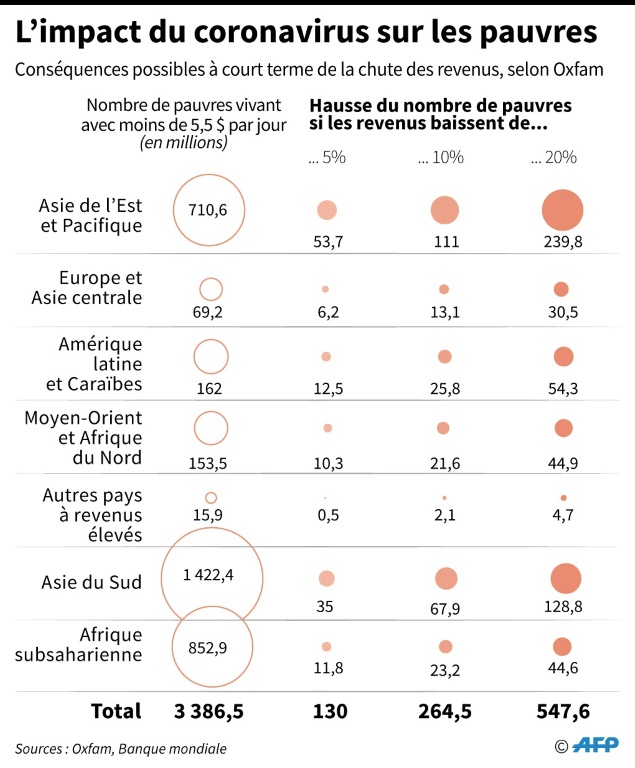 Mais "avec moins de 20% de la population employée dans le secteur formel, avec des systèmes de protection sociale inexistants pour le secteur informel, sans régime d'assurance chômage, avec des possibilités très restreintes de soutien de l'économie par les finances publiques, la situation est particulièrement critique pour l'Afrique", souligne le cabinet d'analyse Finactu.