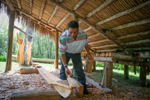 Daniel Tommie, membre de la tribu Séminole, construit un canöe au Musée Ah-Tah-Thi-Ki, dans la réserve séminole de Clewistan, le 22 octobre 2019 en Floride (AFP/Zak BENNETT )
