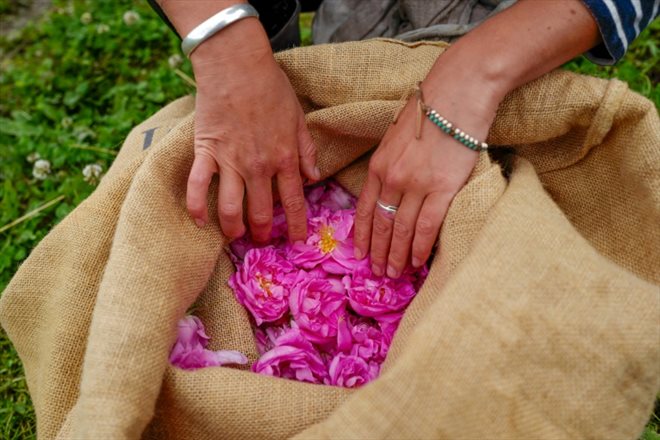 Moins physique que le jasmin dont les récolteurs démarrent à l'aube et travaillent courbés, la cueillette de la rose centifolia ou rose à cent-feuilles, embauche vers 09h00. Tout cesse impérativement avant 13h00 quand le soleil tape trop fort.