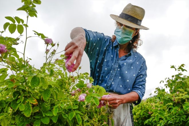 A Grasse, berceau mondial de la parfumerie dans le sud-est de la France, la rose de mai est en fleur, mais dans les champs, "bosser avec un masque et ne pas la sentir, c'est un peu frustrant!".