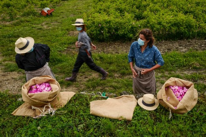 Cette année, chacun a son propre sac en toile de jute, identifié par un ruban de couleur, afin de garder les distances: champagne pour Blanche, orange pour Michel... Au camion, une seule personne est préposée pour livrer à l'usine où les pétales atterrissent dans des cuves d'extractionCarole est l'héritière de trois hectares cultivés en famille. Elle loue aussi une parcelle sanctuarisée grâce à un plan révisé de la commune en faveur des plantes à parfum.