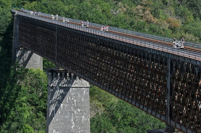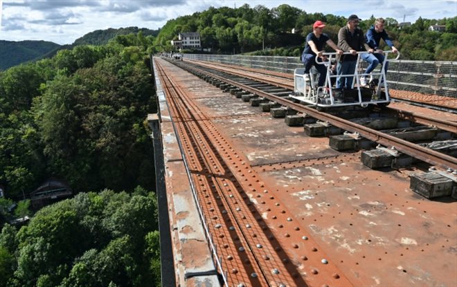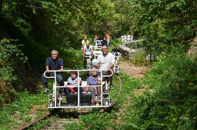 Aux Ancizes (Puy-de-Dôme), le vélorail -engin à cinq places qui permet de parcourir une voie ferrée en pédalant- inauguré en juin affiche complet une semaine à l'avance.