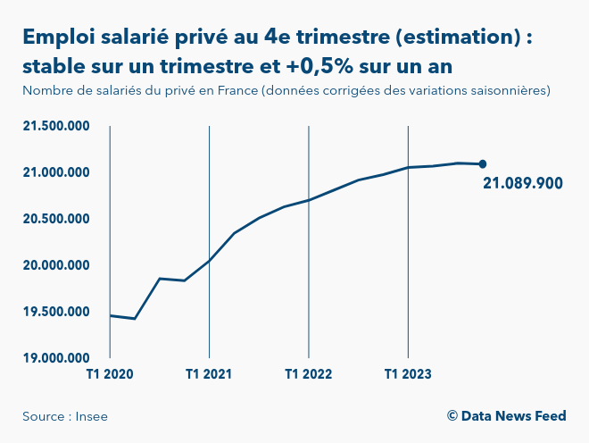 Au 4e trimestre 2023, le nombre de salariés du privé en France s’établirait à 21.089.900, selon l’estimation flash de l’Institut national de la statistique et des études économiques (Insee) publiée à 8h45. Il serait stable par rapport au trimestre précédent (21.098.300 salariés).