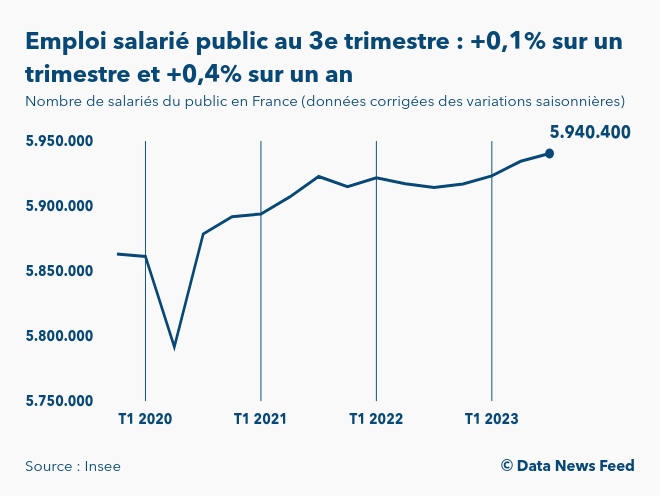 Le nombre de salariés du public en France s’établit à 5.940.400 au 3e trimestre 2023, selon les chiffres diffusés par l’Institut national de la statistique et des études économiques (Insee) ce matin à 7h30. L’emploi dans la fonction publique augmente ainsi de 0,1% (+6.000) par rapport au trimestre précédent (5.934.400 salariés, chiffre qui vient d’être révisé par l’Insee). Sur un an, l’emploi salarié public grimpe de 0,4% (+26.200).