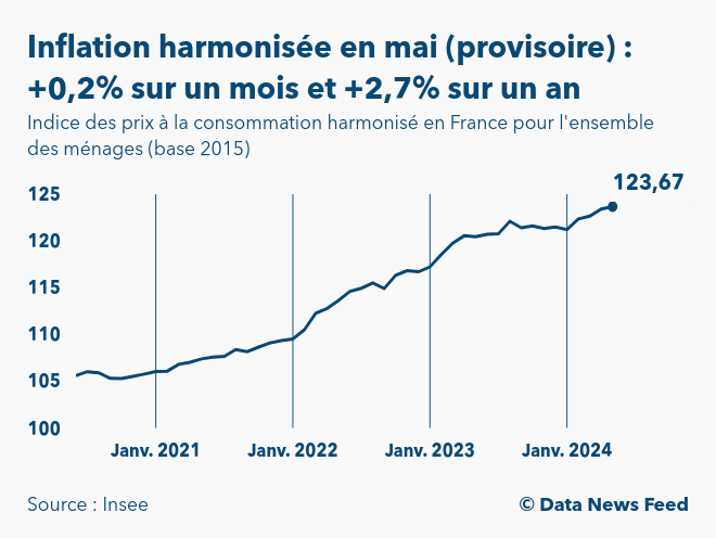 Selon les premières estimations de l’Institut national de la statistique et des études économiques (Insee) publiées à 8h45, l’indice des prix à la consommation harmonisé (IPCH) en France ressortirait à 123,7 points en mai 2024 (base 100 en 2015). Ainsi, l’inflation selon les méthodes de calcul utilisées au niveau de l’Union européenne s’établirait à +0,2% sur un mois et à +2,7% sur un an.
