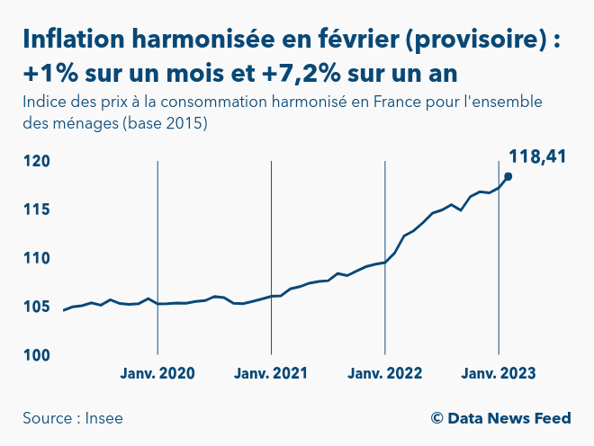Selon les premières estimations de l’Institut national de la statistique et des études économiques (Insee) publiées à 8h45, l’indice des prix à la consommation harmonisé (IPCH) en France ressortirait à 118,4 points en février 2023 (base 100 en 2015). Ainsi, l’inflation selon les méthodes de calcul utilisées au niveau de l’Union européenne s’établirait à +1% sur un mois et à +7,2% sur un an.